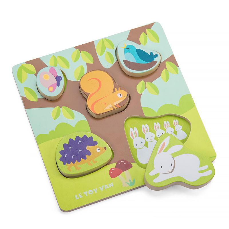 Уценка. Нарушена упаковка производителя. Замечательная развивающая игрушка для малышей от 1 года. Деревянный планшет размером 21 х 21 х 2 см и 5 вкладышей. Ребенок знакомится с основными животными леса и учится считать от 1 до 5. Красочная упаковка. Материал — дерево.